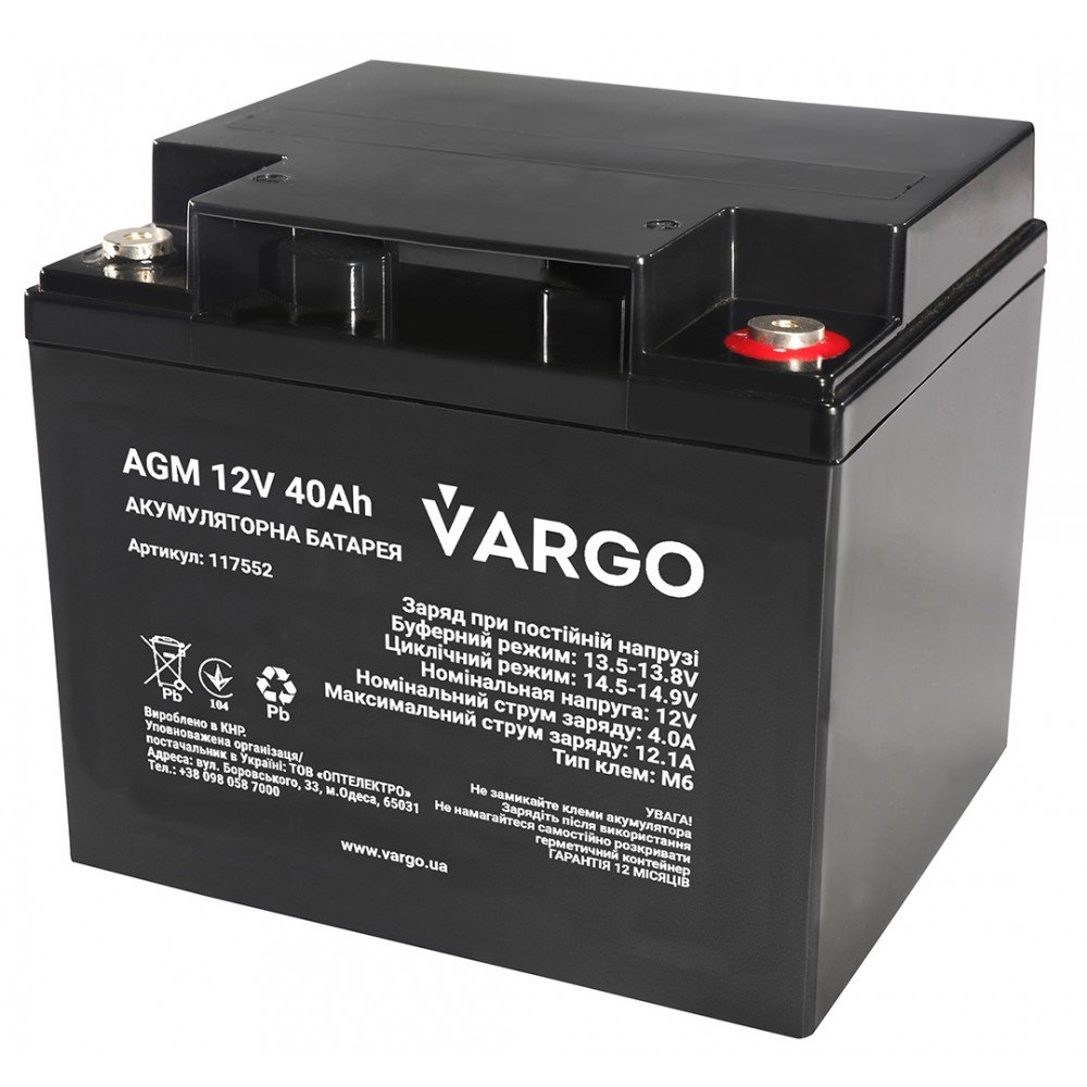 VARGO V-1175452 – свинцово кислотный аккумулятор на базе AGM технологии с емкостью 40 Aч и рабочим напряжением 12 Вольт для различного слаботочного оборудования.