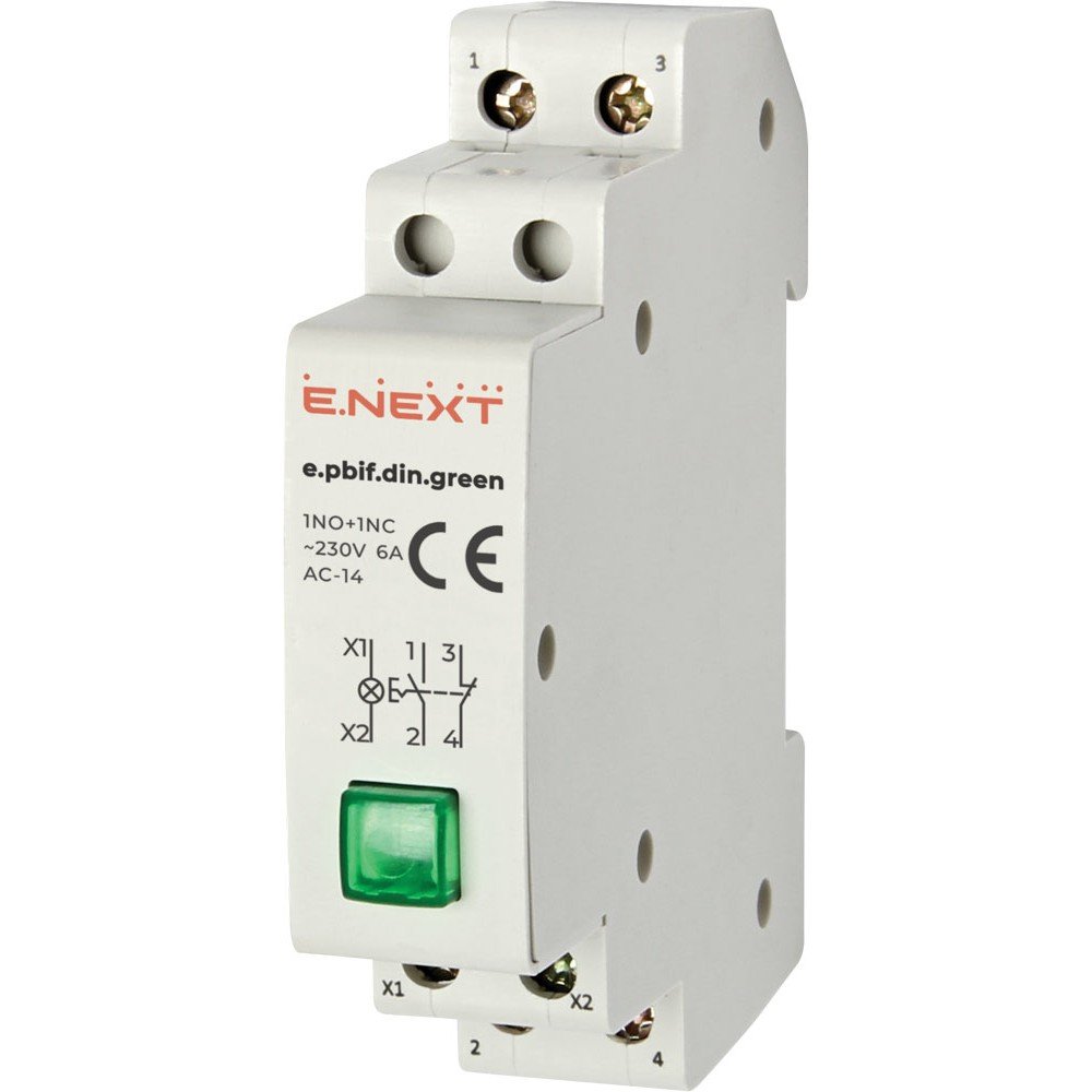 Кнопка з індикатором з фіксатором на DIN-рейку e.pbif.din.green, зелена, призначений для управління електричним обладнанням.