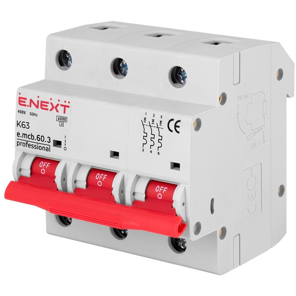 Модульний автоматичний вимикач e.mcb.pro.60.3.K 63 new, 3р, 63А, K, 6кА new призначені для захисту електричних мереж та обладнання низької напруги від струмів перевантаження та короткого замикання, а також нечастих оперативних комутації електричних мереж.