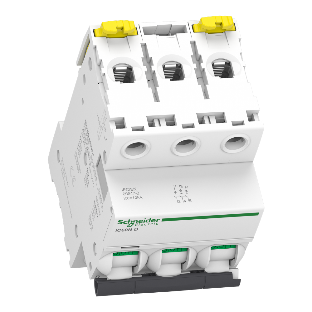 Acti9 iC60N є низьковольтним автоматичним вимикачем (АВ). Це трьохполюсний автоматичний вимикач з номінальним струмом 16 А та кривою відключення D. Номінальна відключаюча здатність при короткому замиканні 20 кА при напрузі від 220 до 240 В змінного струму відповідно до стандарту МЕК 60947-2 і 6000 А при напрузі 400 В змінного струму відповідно до стандарту МЕК 60898-1. Автоматичний вимикач захищає електричне коло від стумів короткого замикання та перевантаження. Механічний індикатор VisiTrip сигналізує про спрацювання автоматичного вимикача, чим скорочує час виявлення проблеми та її вирішення. Зелена смужка VisiSafe гарантує фізичне розмикання контактів, що дозволяє безпечно проводити технічне обслуговування. Механізм миттєвого спрацювання збільшує термін експлуатації. Він має електричну зносостійкість до 10 000 циклів і механічну зносотійкість до 20 000 циклів. Номінальна напруга ізоляції Ui становить 500 В змінного струму. Його клас обмеження 3 (відповідно до МЕК60898-1). Призначений для встановлення на DIN-рейку. Його ширина складає 6 модулів по 9 мм. Ступінь забруднення пристрою 3. Категорія перенапруги IV. Колір виробу білий (RAL9003). Розміри: (Ш) 54 мм x (В) 85 мм x (Г) 78,5 мм. Вага 0,375 кг. Відповідно до стандарту МЕК 60529, ступінь захисту IP20 і IP40 при встановленні в щиті. Робоча температура від -35°C до 70°C. Температура зберігання від -40°C до 85°C.