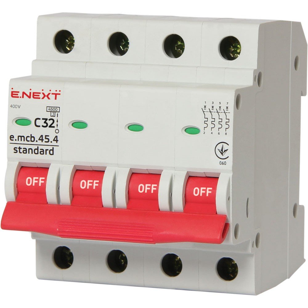 Модульний автоматичний вимикач e.mcb.stand.45.4.C32, 4р, 32А, C, 4,5 кА призначені для захисту електричних мереж та обладнання низької напруги від струмів перевантаження та короткого замикання, а також нечастих оперативних комутації електричних мереж.
