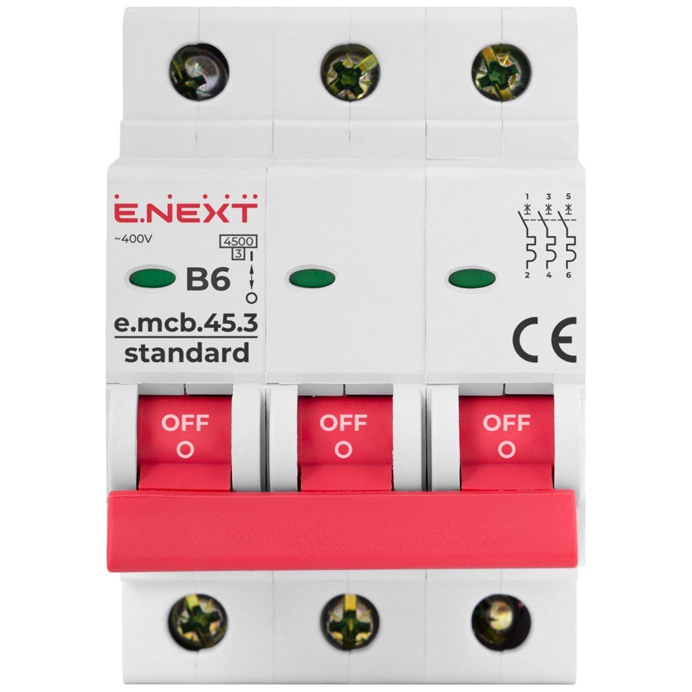 Модульний автоматичний вимикач e.mcb.stand.45.3.B6, 3р, 6А, В, 4,5 кА призначені для захисту електричних мереж та обладнання низької напруги від струмів перевантаження та короткого замикання, а також нечастих оперативних комутації електричних мереж.