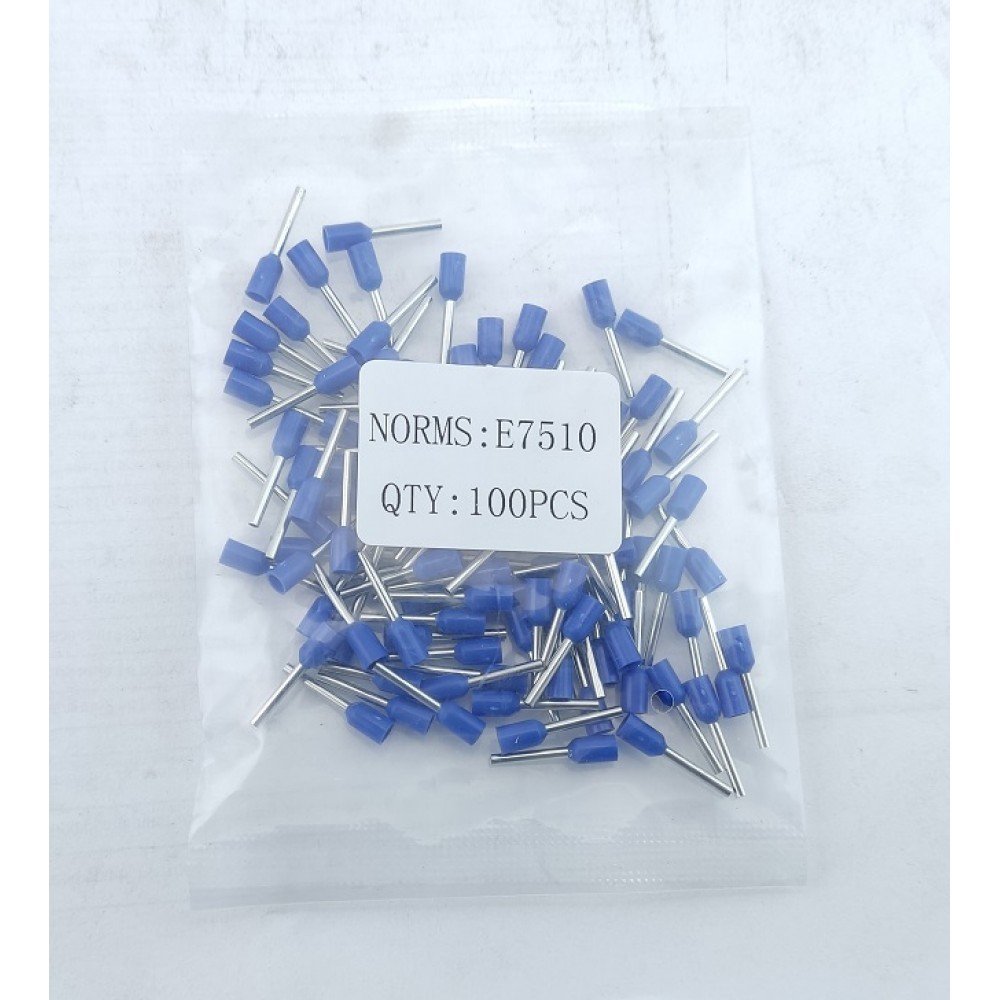 Наконечник гильза Е7510 0.75мм2 - призначений для окінцювання проводів і підключення їх до контактних затискачів різного електроустаткування наприклад (клемних блоків, автоматичних вимикачів, набірних затискачів, розеток тощо). Даний вид наконечника призначений для окінцювання багатодротяних гнучких проводів. З'єднання наконечника відбувається наступним чином: зачищений кінець багатодротяного провідника заводиться всередину порожнистої кінцевої труби і вже потім опресовується разом з трубкою за допомогою спеціального інструменту, утворюючи єдину конструкцію, що надійно фіксує пучок багатодротяної жили.