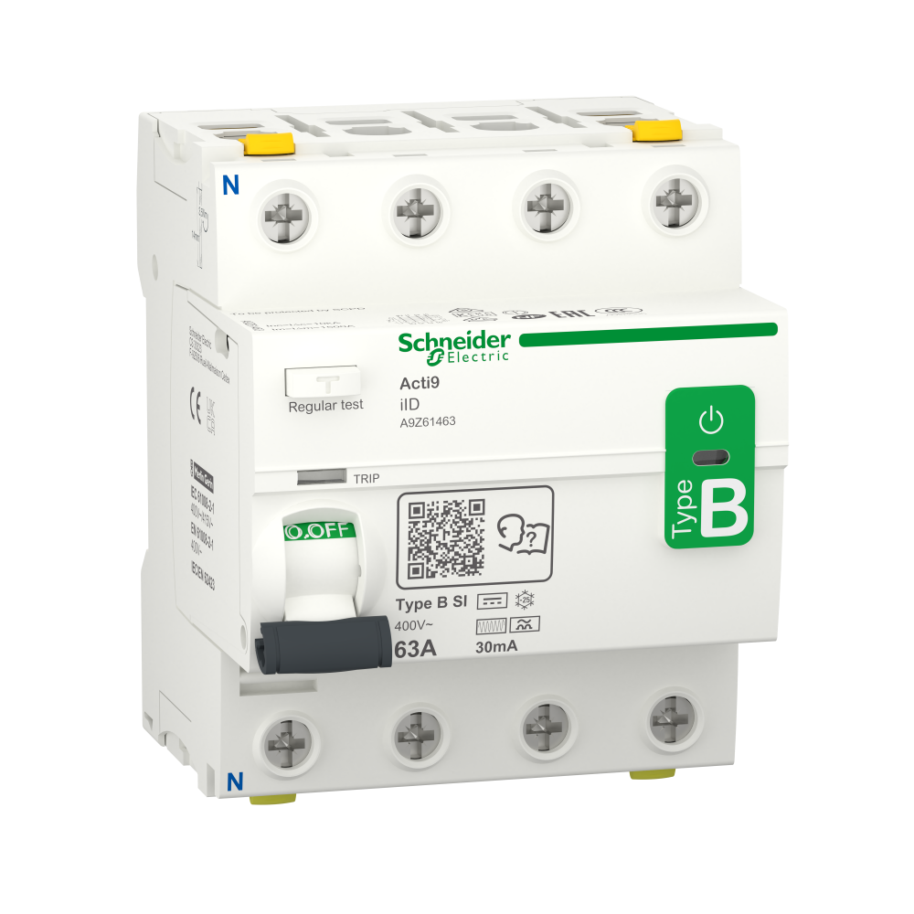 Acti9 iID - це модульний вимикач диференційного струму (ВДС). Це 4-хполюсний вимикач з номінальним струмом 63 А, чутливістю 30 мА, типу BС. Він призначений для захисту людини від ураження електричним струмом через прямий або непрямий контакт, а також від пожежі. Механічний індикатор VisiTrip сигналізує про спрацювання ВДС, чим скорочує час виявлення проблеми та її вирішення. Зелена смужка VisiSafe гарантує фізичне розмикання контактів, що дозволяє безпечно проводити технічне обслуговування. Відповідає стандарту МЕК 61008-1, МЕК 62423. Номінальна відключаюча здатність (Im/IΔm) становить 1500 А. Умовний номінальний струм короткого замикання (Inc/IΔc) становить 10 кА. Електрична зносостійкість до 15000 циклів і механічна до 20000 циклів. Робоча напруга Ue становить 400 В змінного струму. Встановлюється на DIN-рейку. Ширина складає 9 мм - 8. Ступінь забруднення - 3. Категорія перенапруги - IV. Колір виробу - білий (RAL9003). Розміри: (Ш) 72 мм x (В) 88 мм x (Г) 79 мм. Вага - 415 г. Відповідає стандарту МЕК 60529, ступінь захисту - IP20 і IP40. Робоча температура -25°C до 60°C. Температура зберігання -40°C до 85°C.