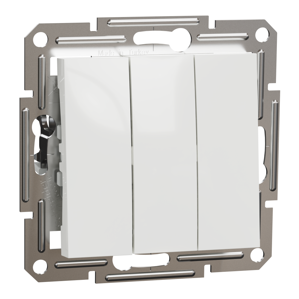 Вимикач Schneider Electric Asfora EPH2170121, механізм із супортом та накладкою білого кольору з 3 клавішами. Це 1-полюсний вимикач. Фіксація пристрою за допомогою гвинтів та монтажних лапок. Номінальний струм 10AX, діапазон потужності 2300 Вт. Розміри вимикача: (Ш) 83 мм x (В) 43 мм x (Г) 83 мм. Пристрій може бути встановленний приховано. Поверхня вимикача глянцева, що надає приміщенню елегантного та вишуканого вигляду. Ступінь захисту IP20. Вимикач виготовлений з ABS (акрилонітрил-бутадієн-стирол) матеріалу, що робить його максимально стійким. Мідний провідниковий матеріал забезпечує надійність. Вимикач отримав сертифікати TSE, VDE. Вимикач відповідає стандарту МЕК 60669-1. Має знак якості CE, UKR. Оновлена фурнітура Asfora тепер має менші, компактніші накладки, профільовану фіксуючу рамку, а також широкі, профільовані монтажні лапки з поворотною пружиною, тим самим покращуючи якість та функціональність пристроїв. Продукція Asfora виготовлена з високоякісних матеріалів, які не жовтіють з часом. Витончений, елегантний дизайн ідеально гармонує з будь-яким інтерєром.