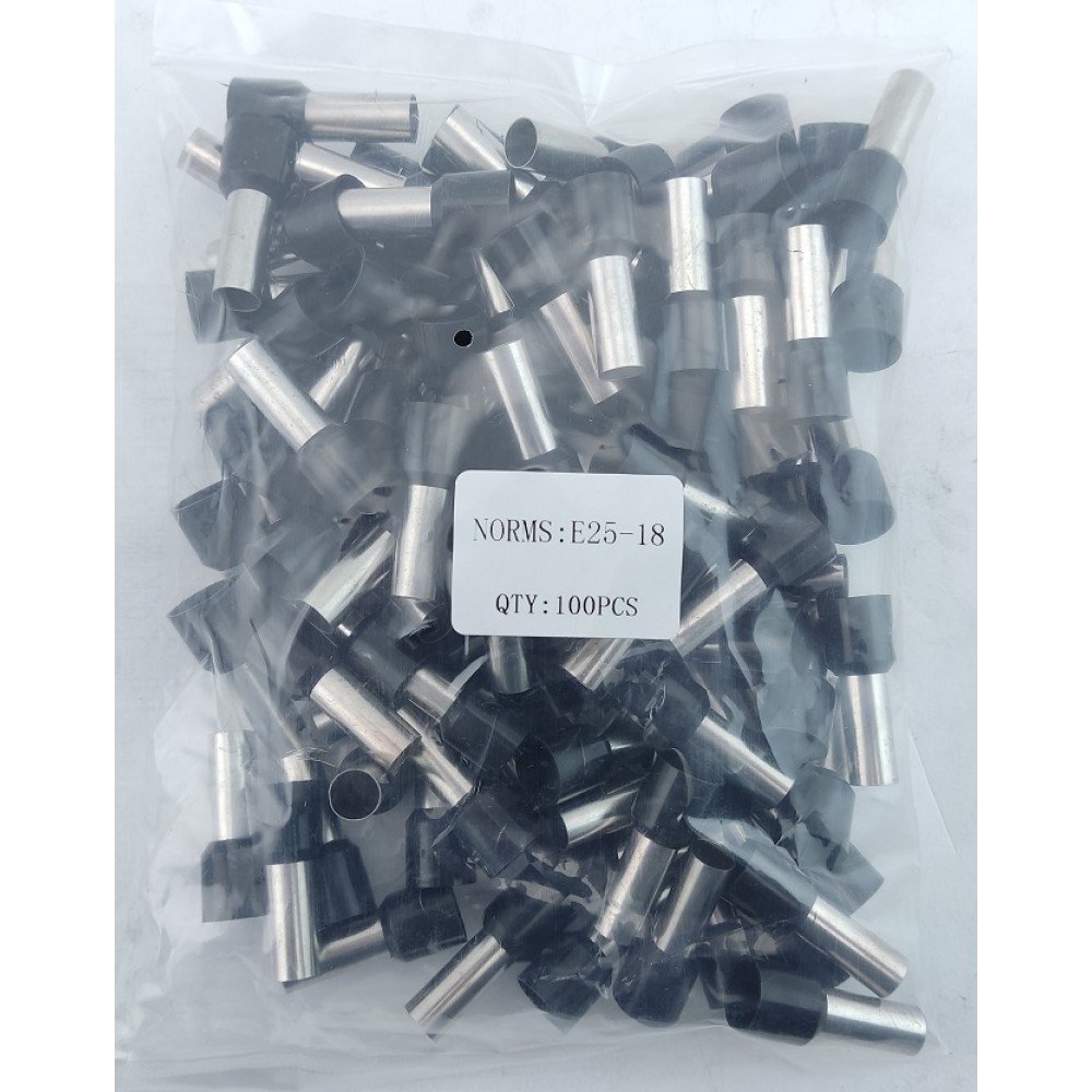 Наконечник гільза Е25-18 25мм2 - призначений для окінцювання проводів і підключення їх до контактних затискачів різного електроустаткування наприклад (клемних блоків, автоматичних вимикачів, набірних затискачів, розеток тощо). Даний вид наконечника призначений для окінцювання багатодротяних гнучких проводів. З'єднання наконечників відбувається таким чином: зачищений кінець багатодротяного провідника заводиться всередину порожнистої кінцевої труби і вже потім опресовується разом з трубкою за допомогою спеціального інструменту, утворюючи єдину конструкцію, надійно фіксую пучок багатодротяної жили.