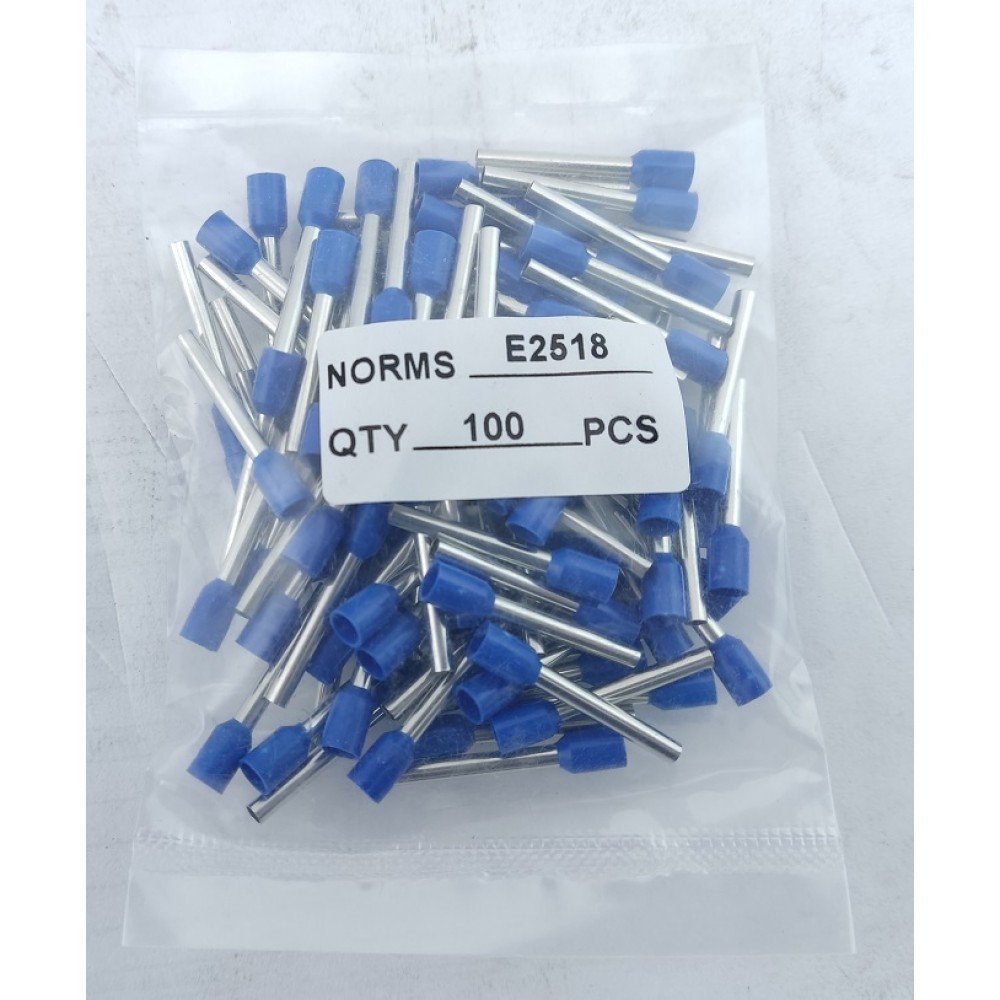 Наконечник гільза Е2518 2,5мм2 - призначений для окінцювання проводів і підключення їх до контактних затискачів різного електроустаткування наприклад (клемних блоків, автоматичних вимикачів, набірних затискачів, розеток тощо). Даний вид наконечника призначений для окінцювання багатодротяних гнучких проводів. З'єднання наконечників відбувається таким чином: зачищений кінець багатодротяного провідника заводиться всередину порожнистої кінцевої труби і вже потім опресовується разом з трубкою за допомогою спеціального інструменту, утворюючи єдину конструкцію, надійно фіксую пучок багатодротяної жили.
