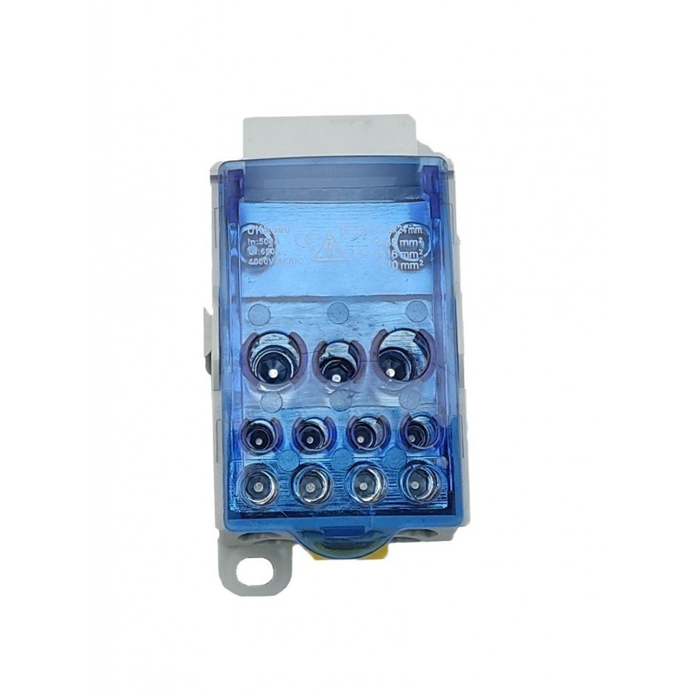 Розподільний блок на DIN-рейку РБД-500А - призначений для використання в якості клемного затиску при підключенні до провідника більшого перерізу кількох провідників меншого перерізу, з метою створення впорядкованої системи розподілу в шафах, для організації головної заземлюючої шини.