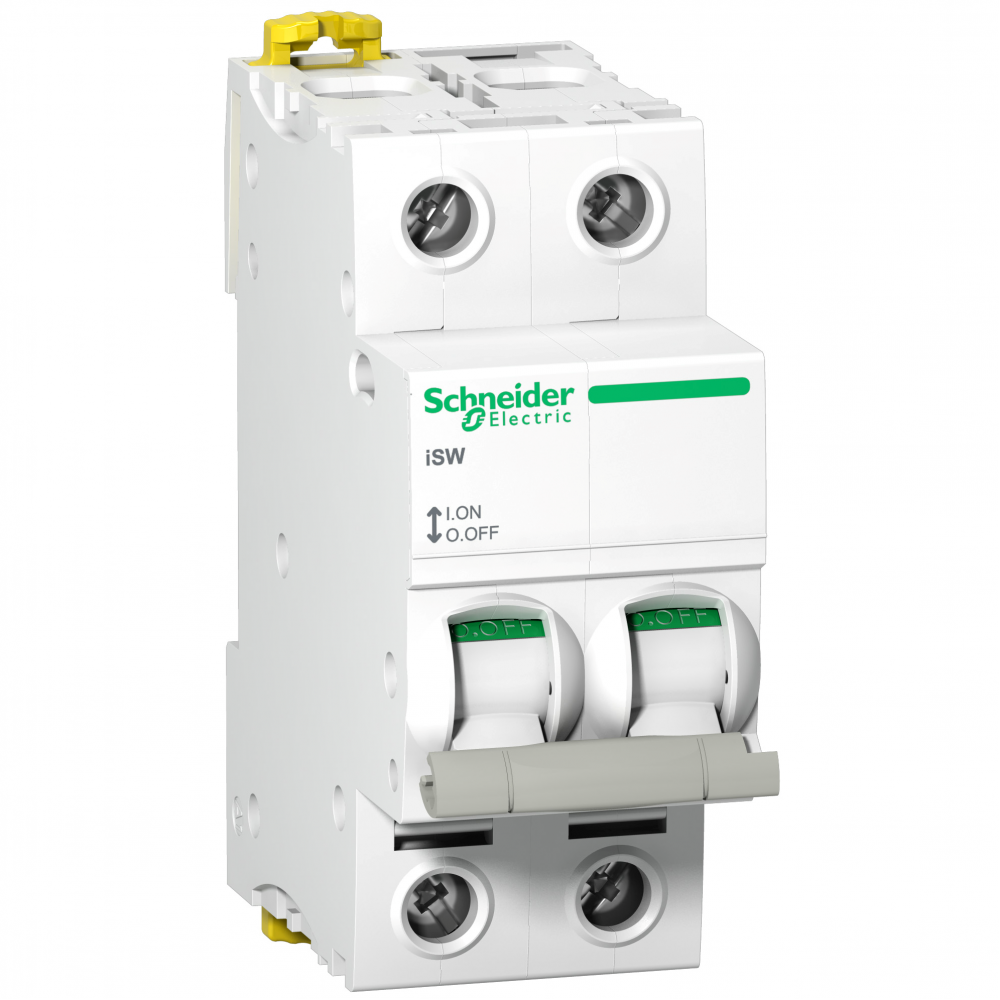 Acti9 iSW - це модульний вимикач навантаження. Це 2-х полюсний вимикач, з номінальним струмом 100 А, робочою напругою 415 В змінного струму. Електрична зносостійкість до 10000 циклів, а механічна до 20000 циклів. Робоча температура від -25°C до +60°C. Температура зберігання від -40°C до +85°C. Ступінь захисту - IP20 і IP40. Встановлюється на DIN-рейку. Ширина з кроком 9 мм - 4. Розміри: (Ш) 36 мм x (В) 85 мм x (Г) 73 мм. Відповідає стандарту EN/IEC 60947-3.