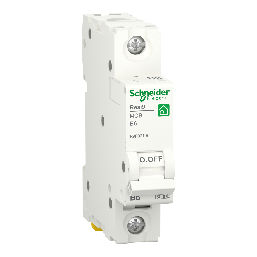 Мініатюрний автоматичний вимикач Resi9. Це 1-полюсний вимикач, з номінальним струмом 6 A та кривою відключення В. Номінальна відключаюча здатність становить до 6000 А при напрузі 230 В АС відповідно до стандарту EN/МЕК 60898-1. Цей продукт відповідає стандарту EN/МЕК 60898-1. Автоматичний вимикач захищає коло від струму короткого замикання та перевантаження. Resi9 призначений для житлового будівництва. Він має електричну витривалість до 10000 циклів і механічну витривалість до 20000 циклів. Робоча напруга Ue становить 230 В змінного струму. Номінальна напруга ізоляції Ui становить 440 В змінного струму. Робоча частота 50 Гц або 60 Гц. Його можна встановити на DIN-рейку для модульної установки. Його ширина становить 2 кроки по 9 мм. Колір виробу білий (RAL9003). Розміри (Ш) 18 мм х (В) 81 мм х (Г) 72 мм. Відповідно до стандарту МЕК 60529, ступінь захисту IP20 і IP40 в щиті. Робоча температура від -25°C до 60°C. Температура зберігання від -40°C до 60°C.